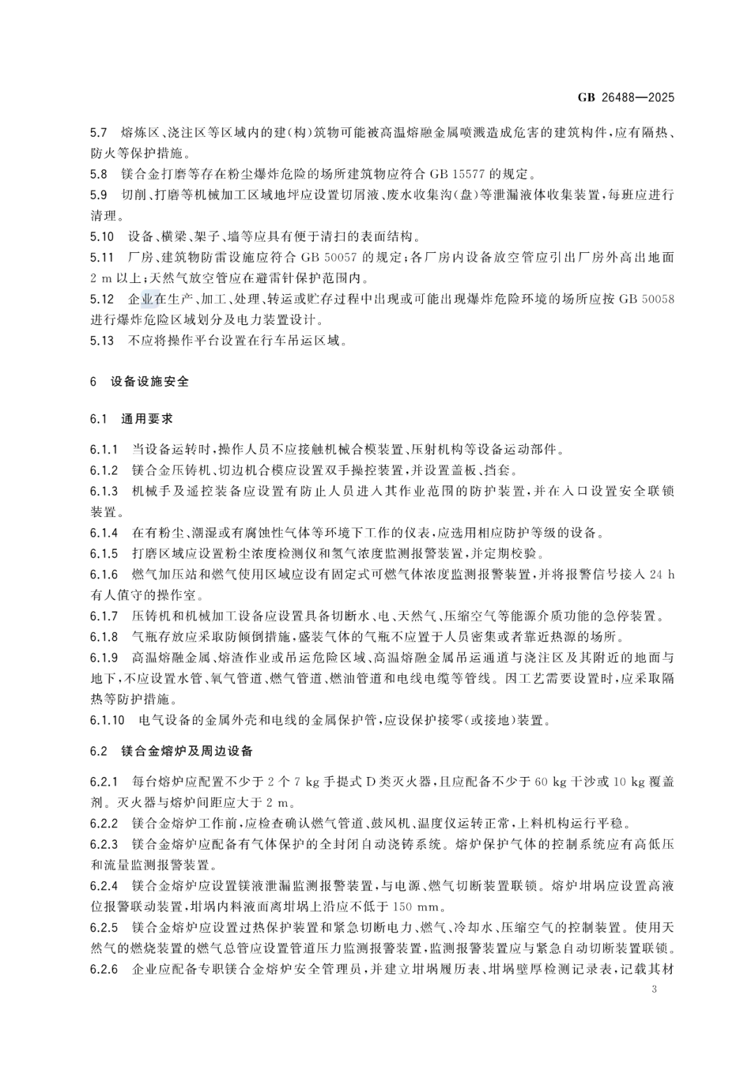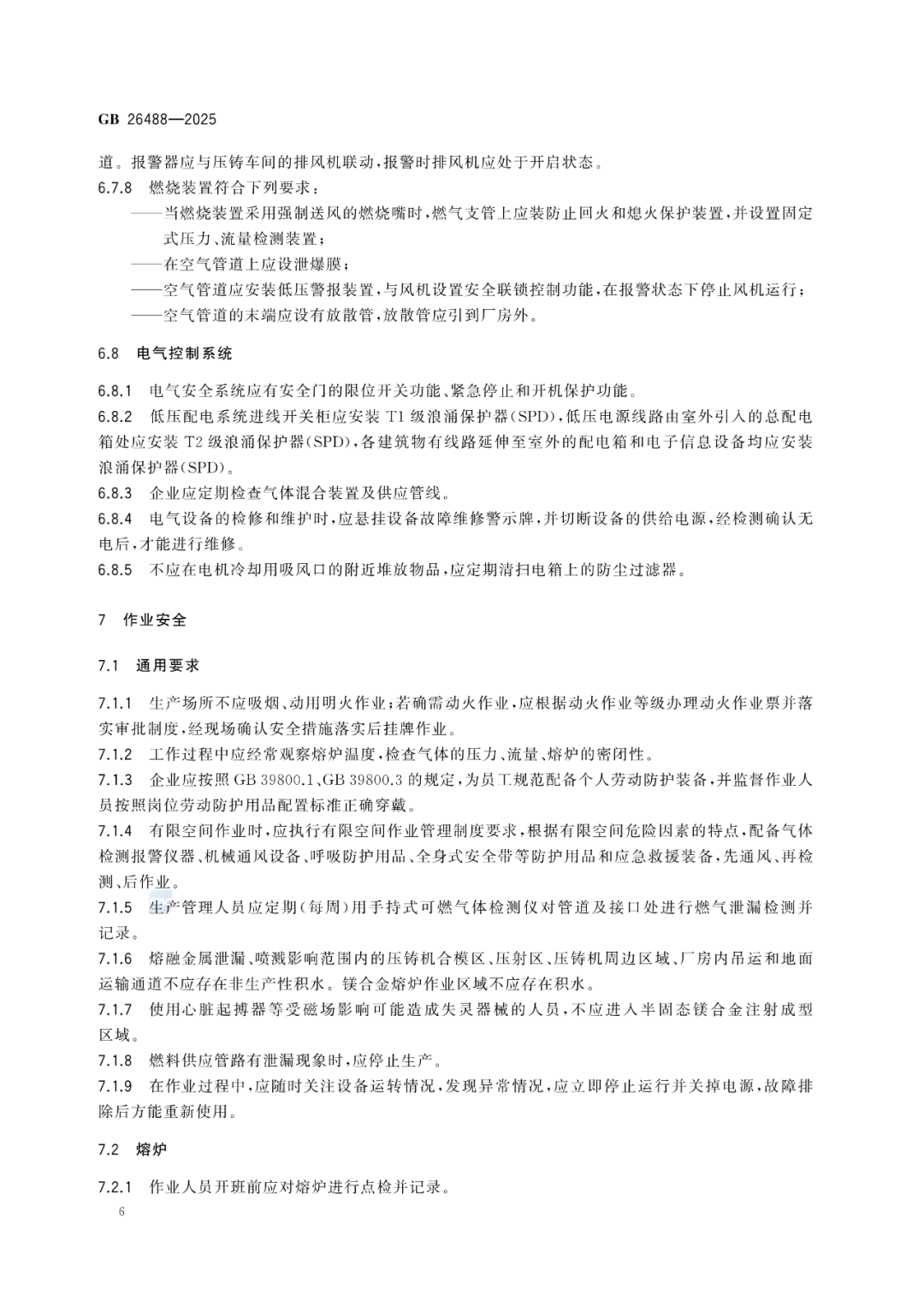 熔炉安全:新增 “坩埚内料液面离上沿不低于 150mm” 的硬性要求(6.2.4),并明确泄漏监测装置需与电源、燃气切断装置联锁,避免熔融镁液溢出引发爆炸;同时要求天然气熔炉必须配备熄火保护和压力监测,确保燃气泄漏能第一时间自动切断。