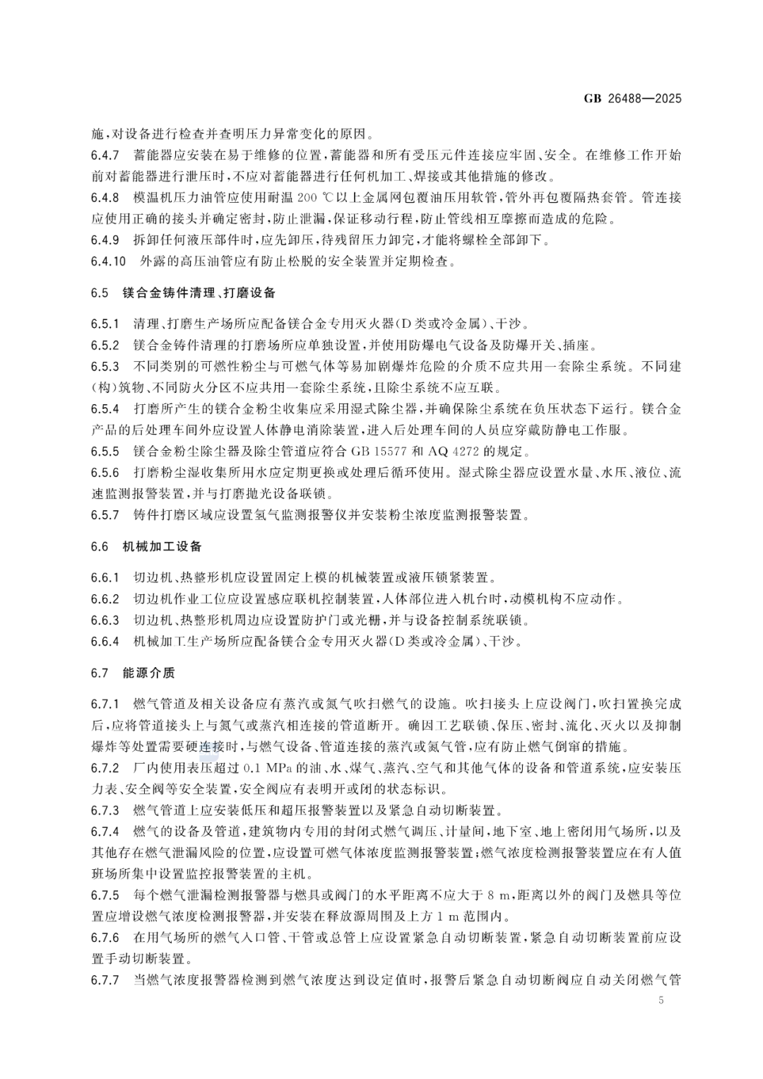清理设备:明确打磨区域必须同时配备粉尘浓度检测仪和氢气浓度报警器(6.5.7),且除尘系统需采用湿式负压设计,杜绝镁粉尘遇空气自燃的风险 —— 这一要求直接对标《粉尘防爆安全规程》(GB15577),填补了旧标在粉尘管理上的空白。