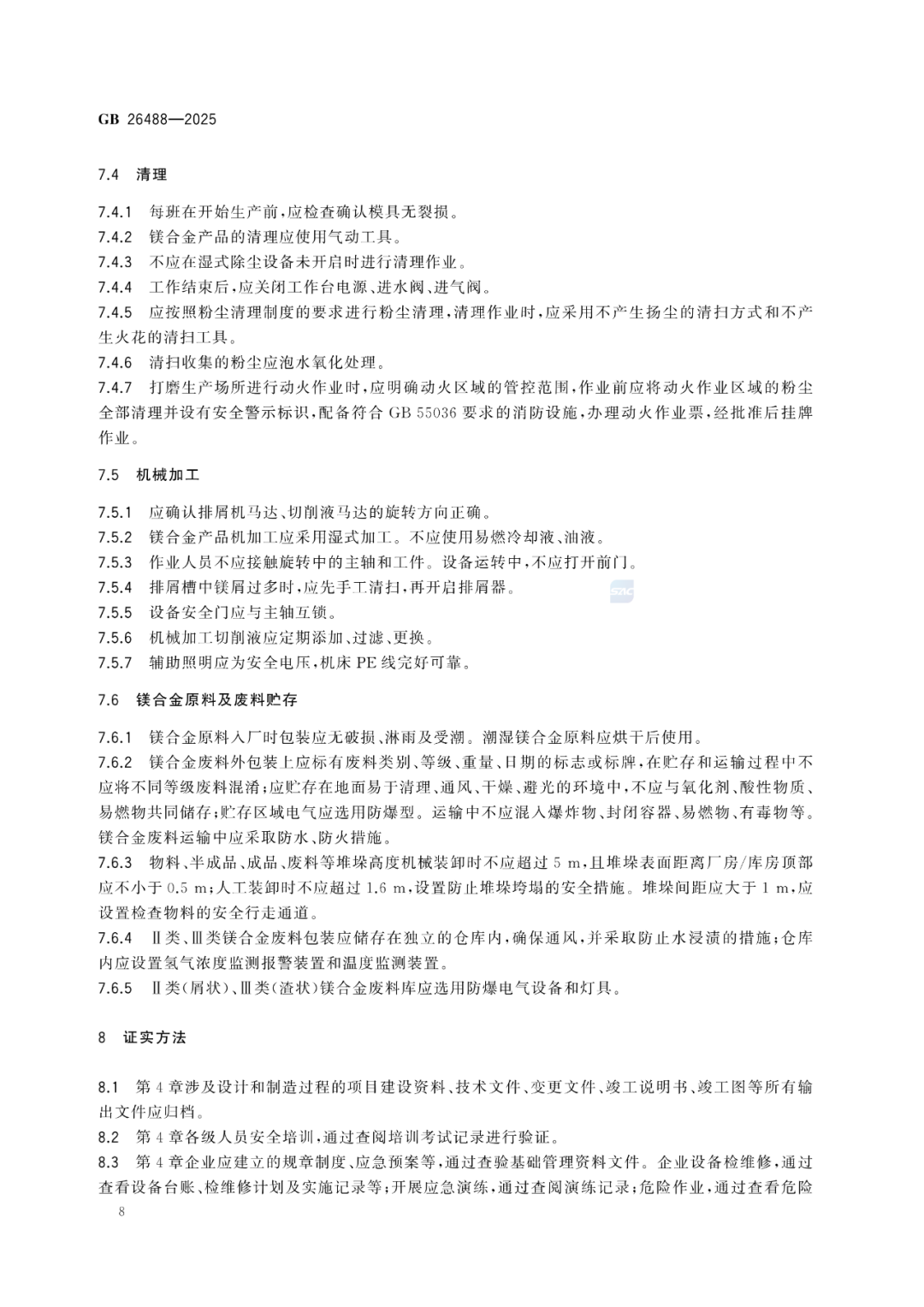 废料管理:规定 Ⅱ 类(屑状)、Ⅲ 类(渣状)镁废料需单独存放在防爆仓库,且仓库必须安装氢气监测和温度报警装置(7.6.4),解决了以往废料随意堆放引发的自燃问题。
