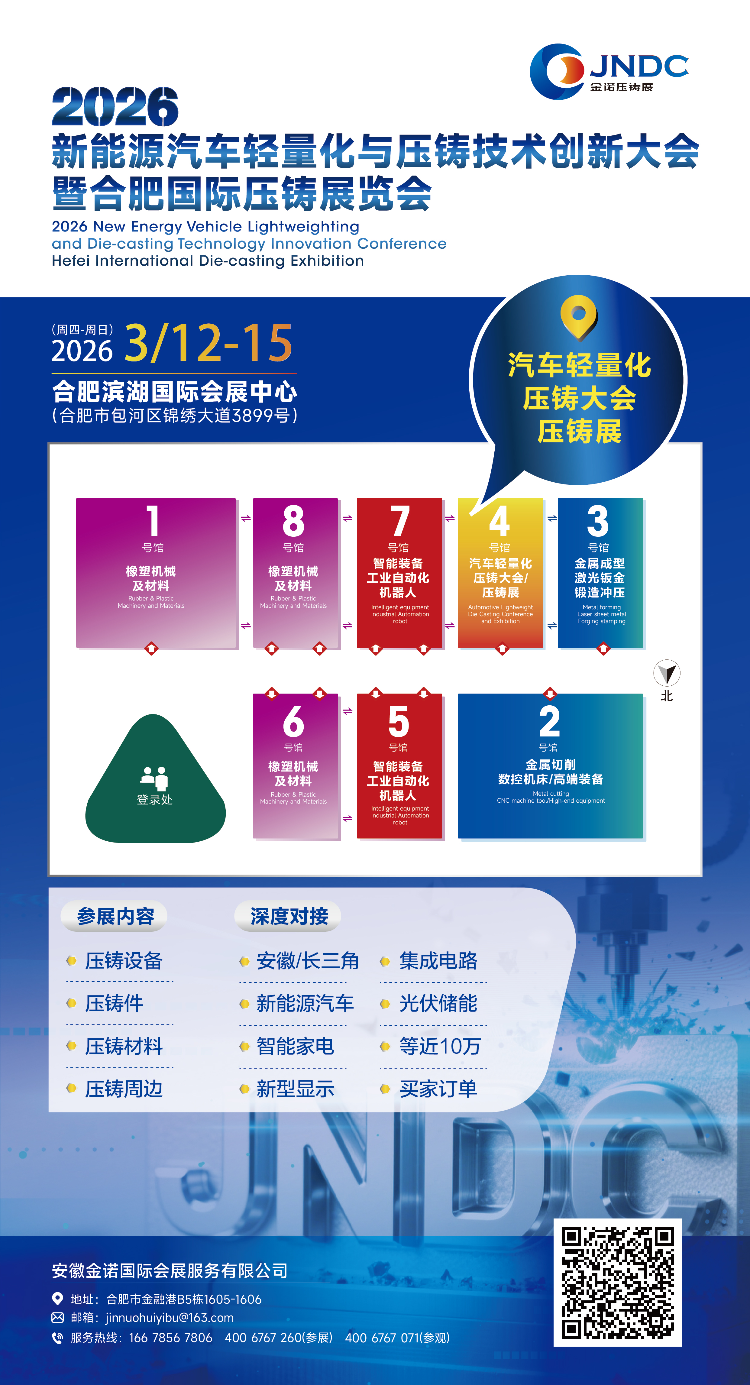 2026年3月12-15日,合肥滨湖国际会展中心,合肥汽车轻量化压铸会议及展览会与金诺机床展、亚太橡塑展、工业自动化暨机器人展共同开启,邀您见证中国压铸产业“由大转强”的历史跨越。即日起,专业观众可登录官网http://www.jndce.com或关注微信“金诺压铸展”或扫描下方二维码免费预登记,前200名注册观众可获赠汽车轻量化压铸会议通票及展会会刊。